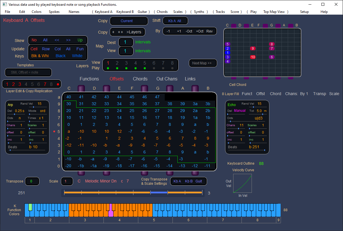 Here, Functions are applied, and decode each incoming note. At the upper right is a chord applied to one note the mouse is hovering over. At the bottom, you can see all the data in the various layers for the note the mouse is hovering over.