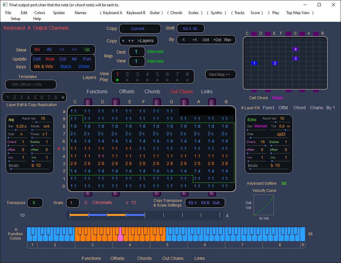 Chords are designed by clicking in the Chords tables, with notes, visually, in any Key Played Chords are then selected in the KG map Chords tables by number (1-256).
