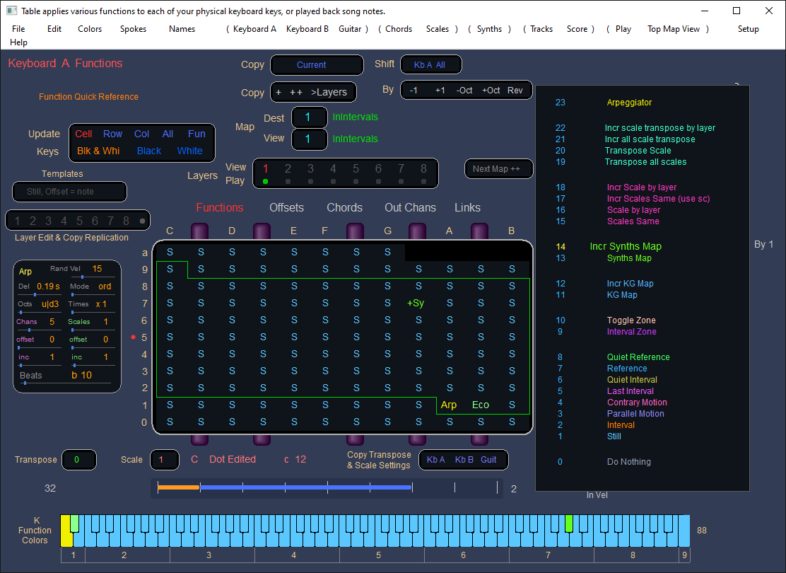 Here, Functions are applied, and decode each incoming note. At the upper right is a chord applied to one note the mouse is hovering over. At the bottom, you can see all the data in the various layers for the note the mouse is hovering over.