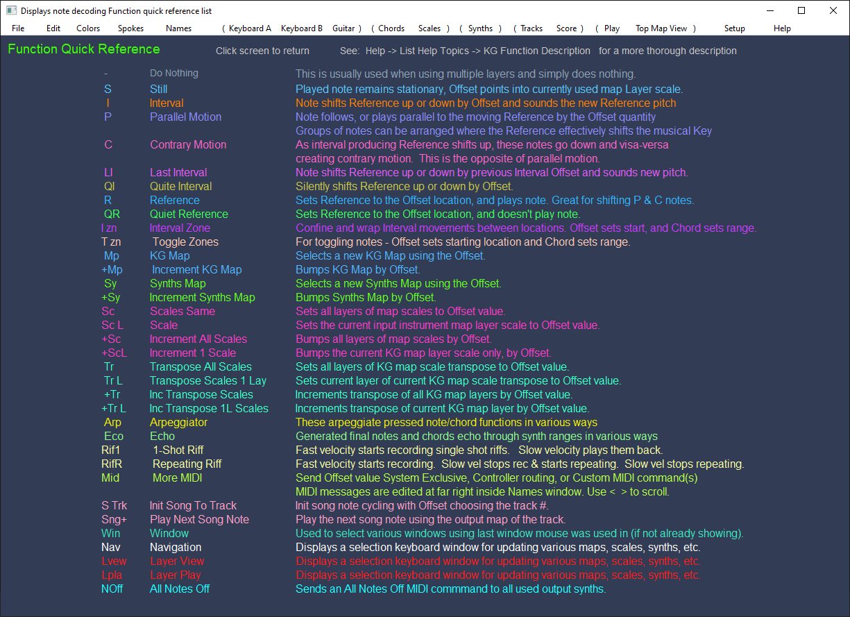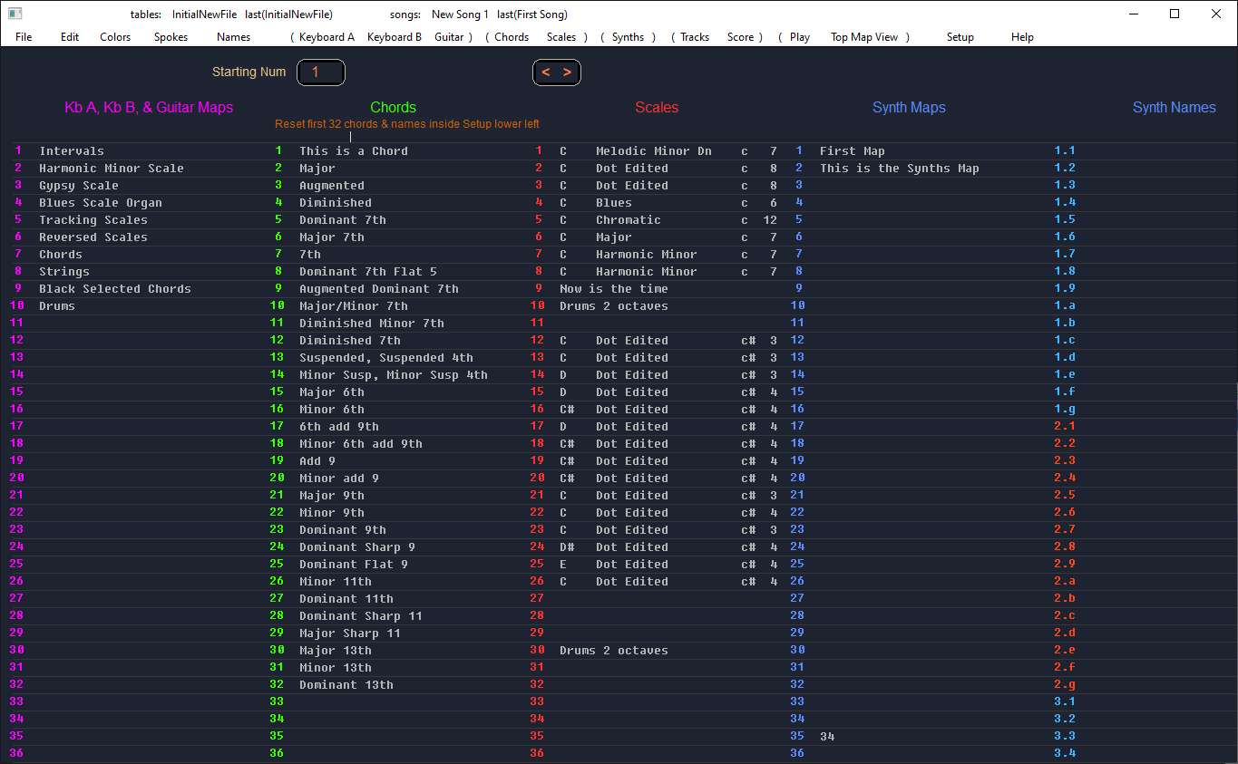 Chords are designed by clicking in the Chords tables, with notes, visually, in any Key Played Chords are then selected in the KG map Chords tables by number (1-256).